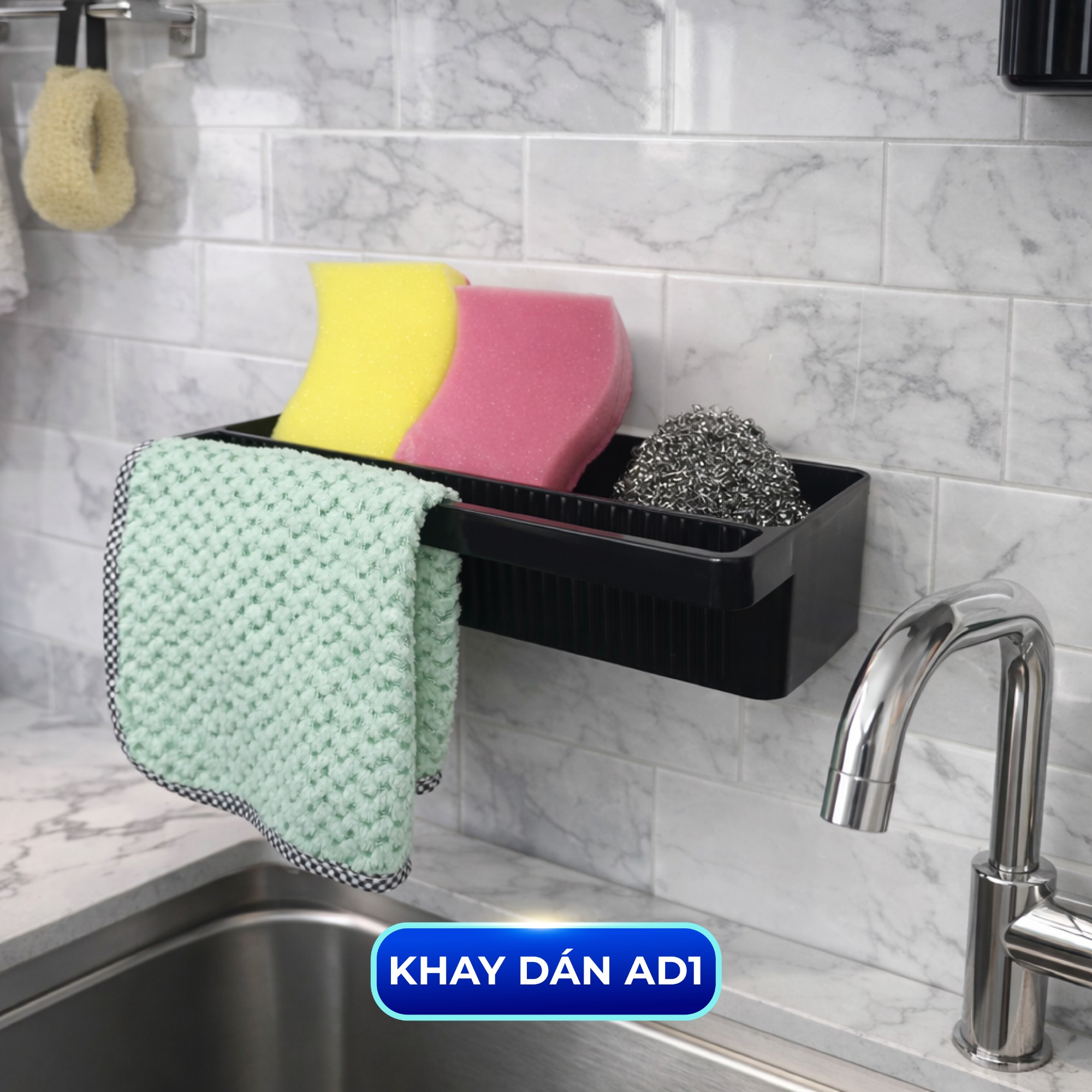 • Khay dán có thanh treo: Để đồ phía trên, treo khăn – treo dụng cụ phía dưới cực tiện.