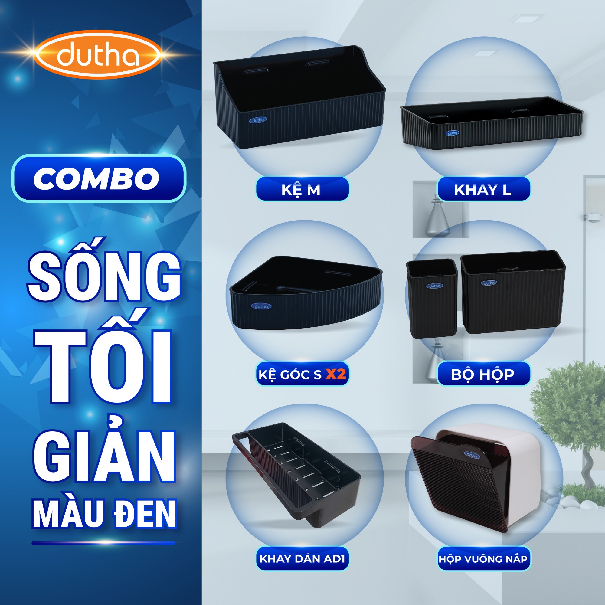 Combo được thiết kế theo tinh thần minimalism hiện đại, lấy tone đen nhám làm chủ đạo – sạch mắt, cá tính và cực kỳ hợp với căn hộ trẻ, nhà tắm nam tính hoặc không gian cần sự gọn gàng tuyệt đối. Tất cả đều dán tường siêu chắc – không khoan, giữ trọn bề mặt tường nguyên vẹn.