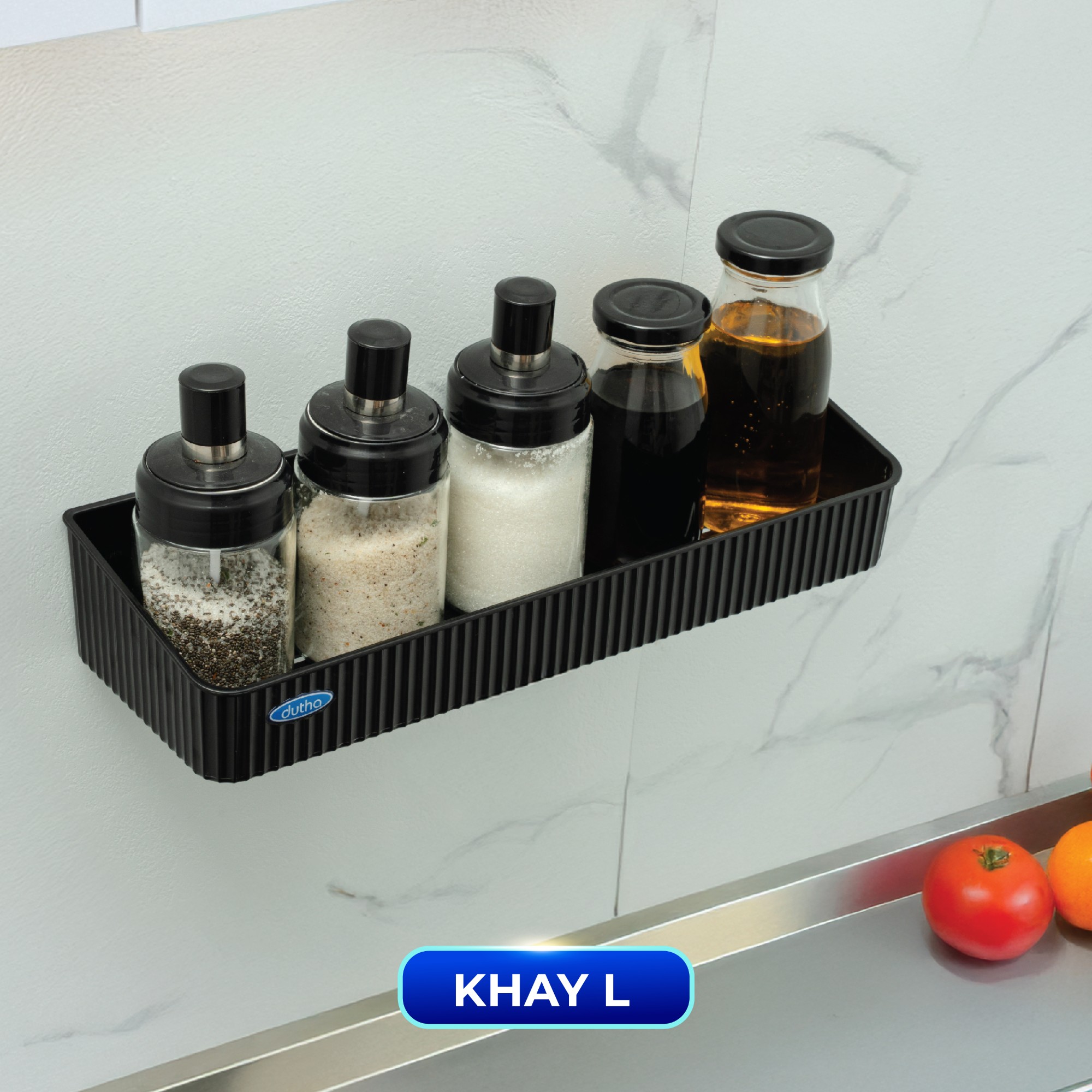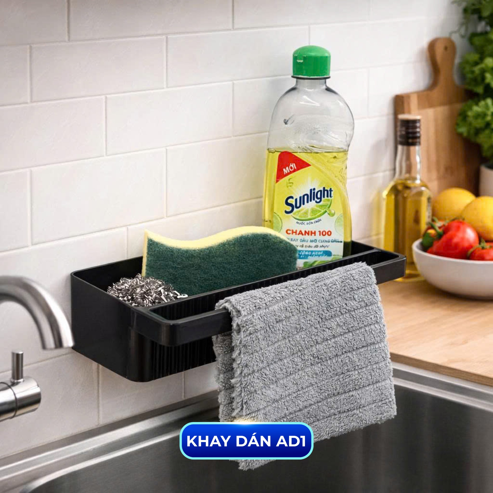 Khay dán có thanh treo: Để dụng cụ rửa bát, gia vị,... có thể treo thêm khăn bếp tiện lợi