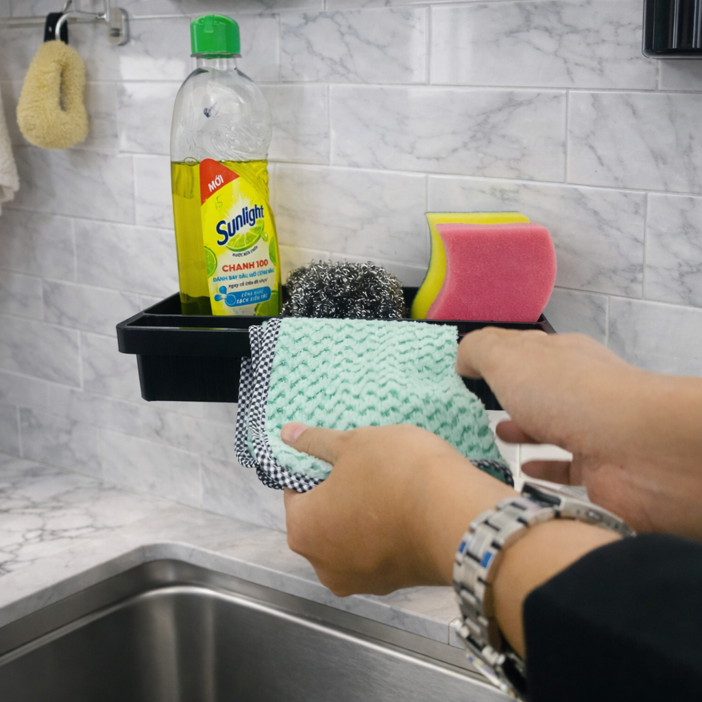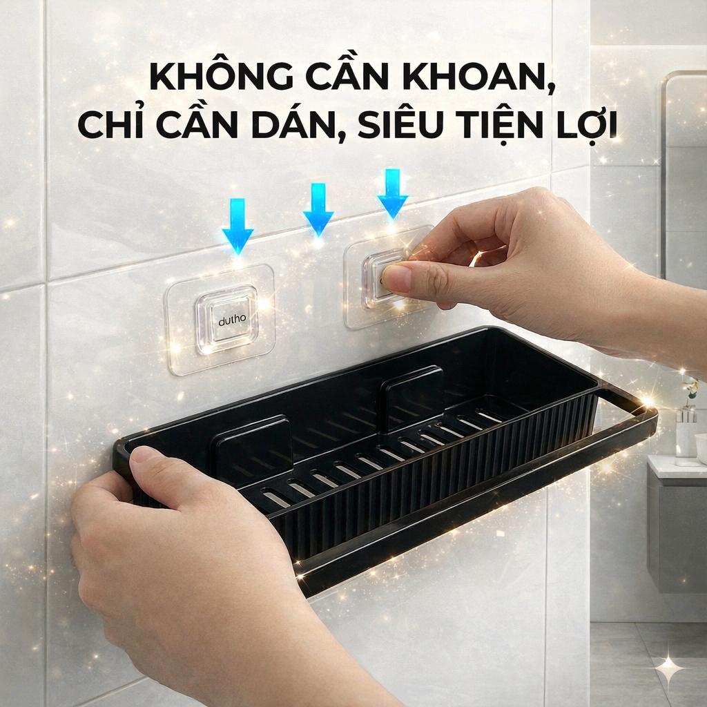 The AD1 super-adhesive tray with hanging bar is designed to solve this problem completely: a storage tray on top + a hanging bar below, securely attached to the wall without drilling, making the space neater, cleaner, and more convenient every day.