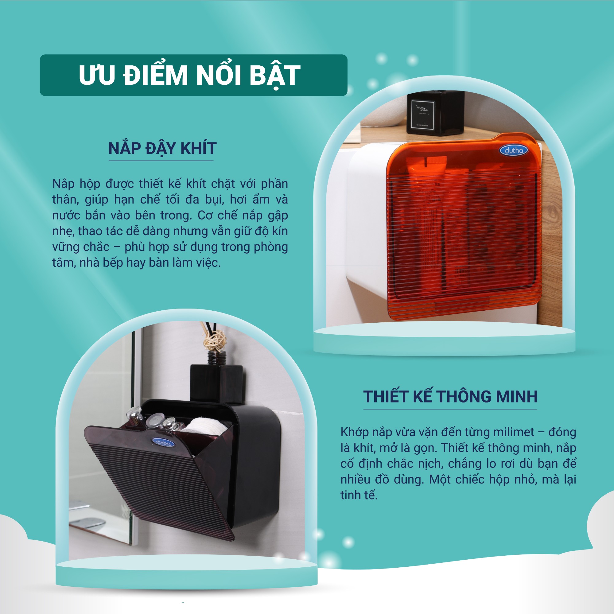 Nắp hộp giúp che đi vật dụng bên trong, hạn chế bụi bẩn, nước bắn và giữ tính riêng tư cho đồ cá nhân.