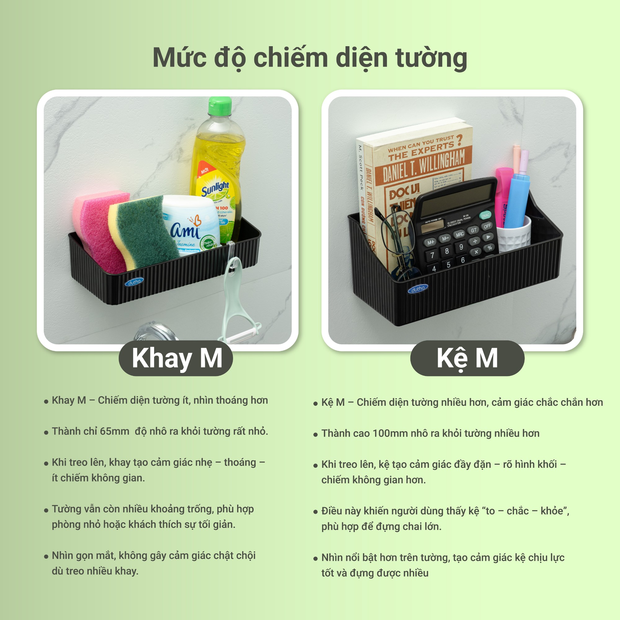 Trong hệ sản phẩm dán tường của Dutha, Khay M và Kệ M là hai lựa chọn được khách hàng quan tâm nhiều nhất.