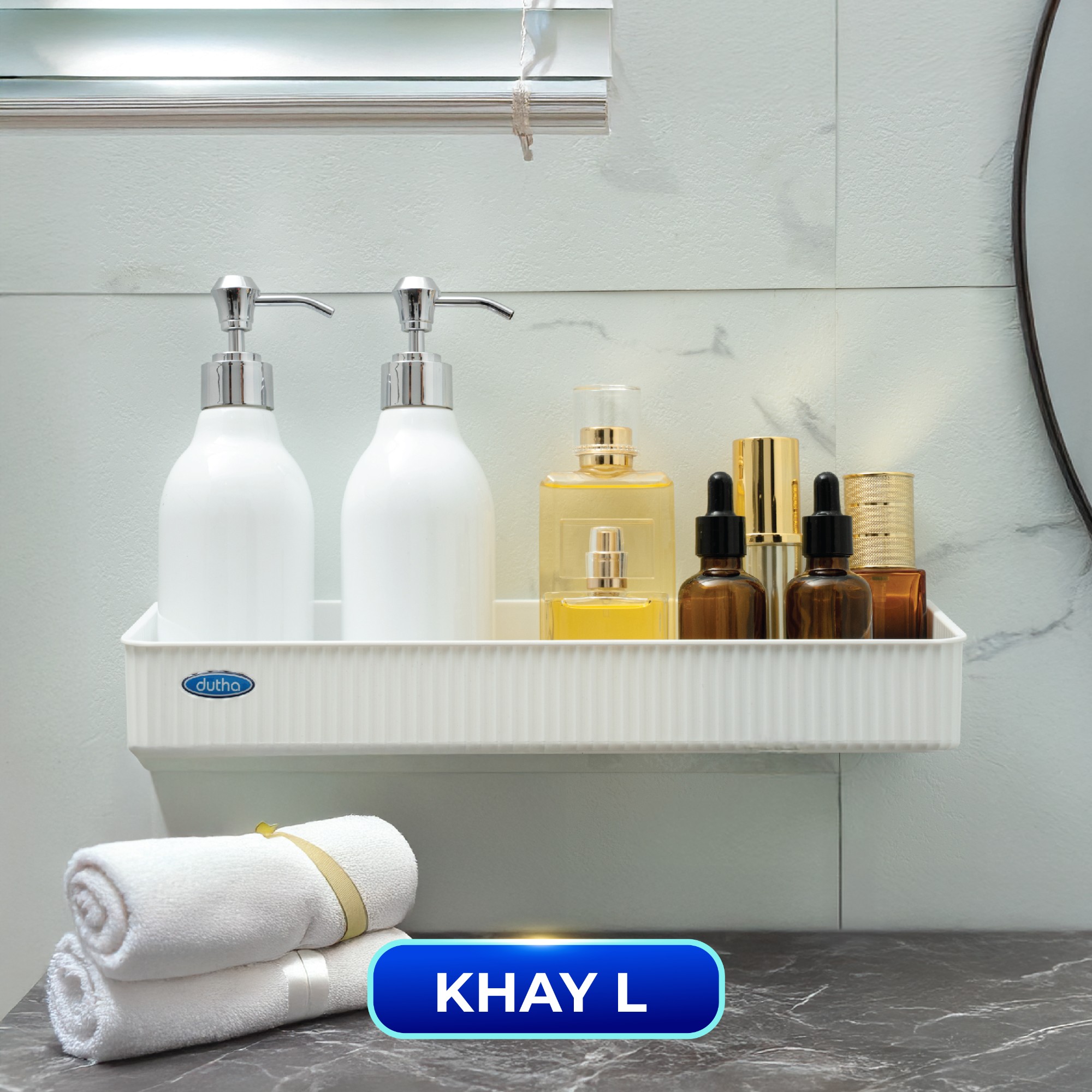 Khay L: Sức chứa lớn, để combo chai to hoặc đồ dùng gia đình.
