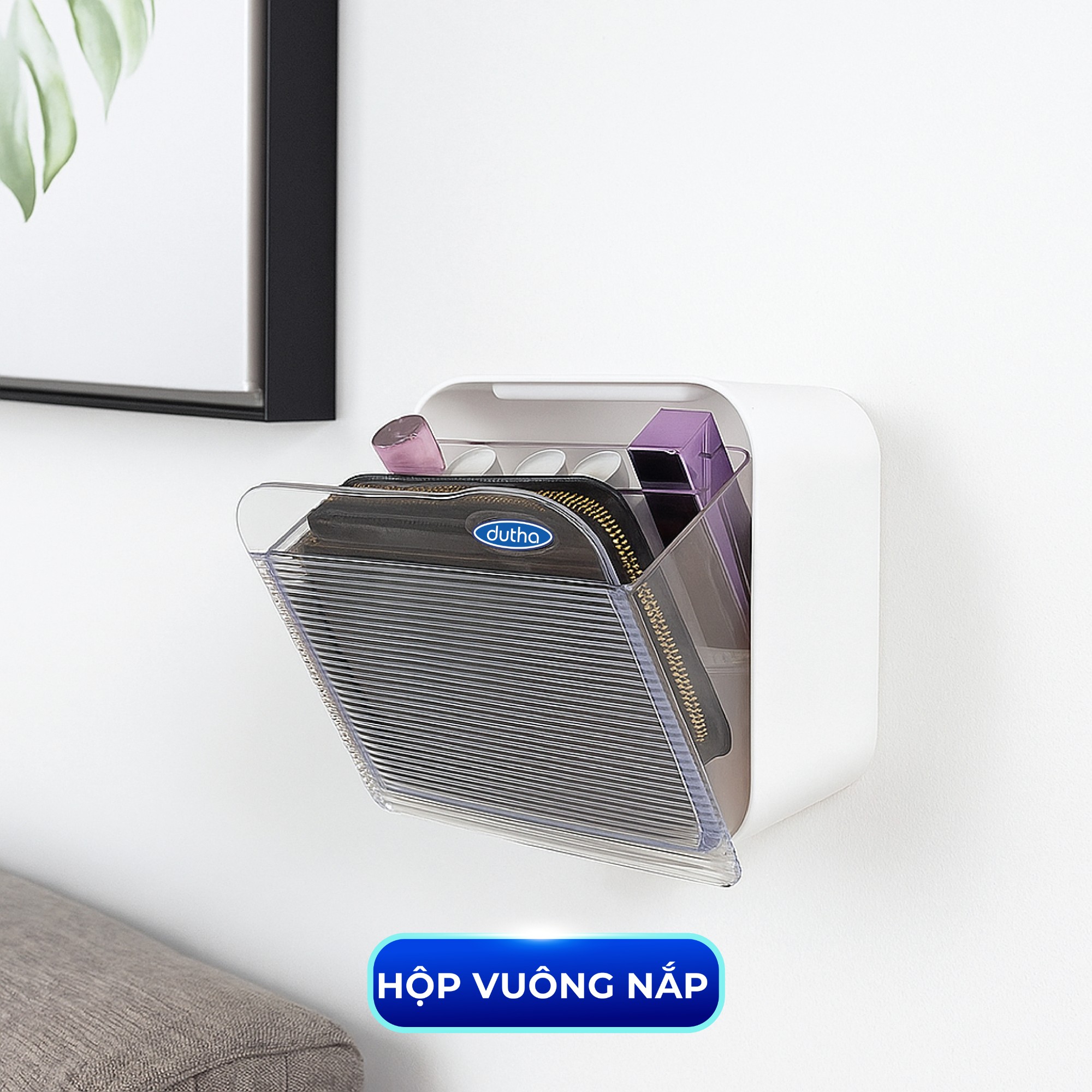 Hộp vuông nắp: Bảo quản bông tẩy trang, băng vệ sinh, vật dụng cá nhân sạch sẽ.