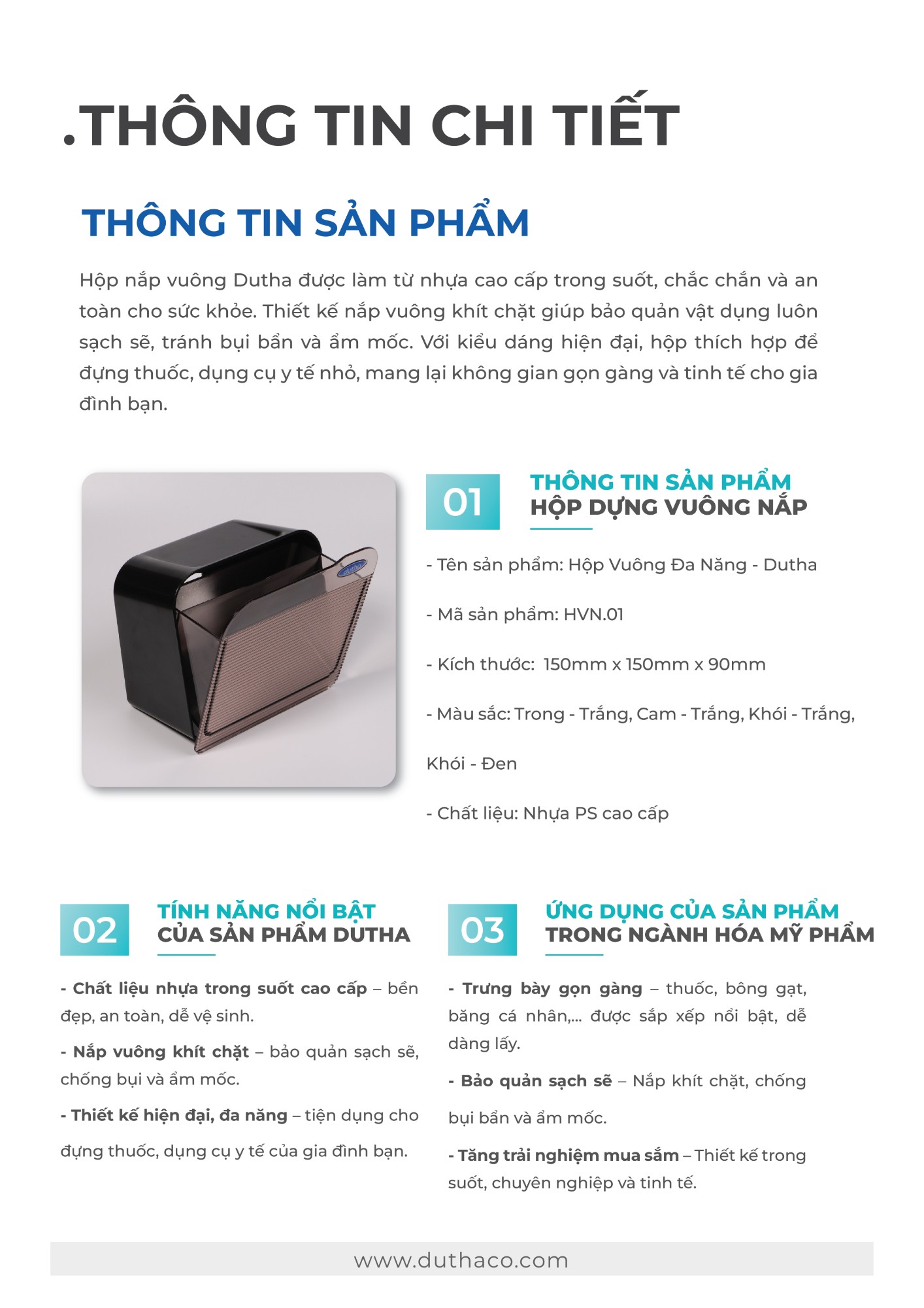 Hộp Dutha sử dụng nhựa PS trong/xám khói/cam giúp nhìn thấy mọi thứ bên trong, thiết kế tinh tế và thông minh.